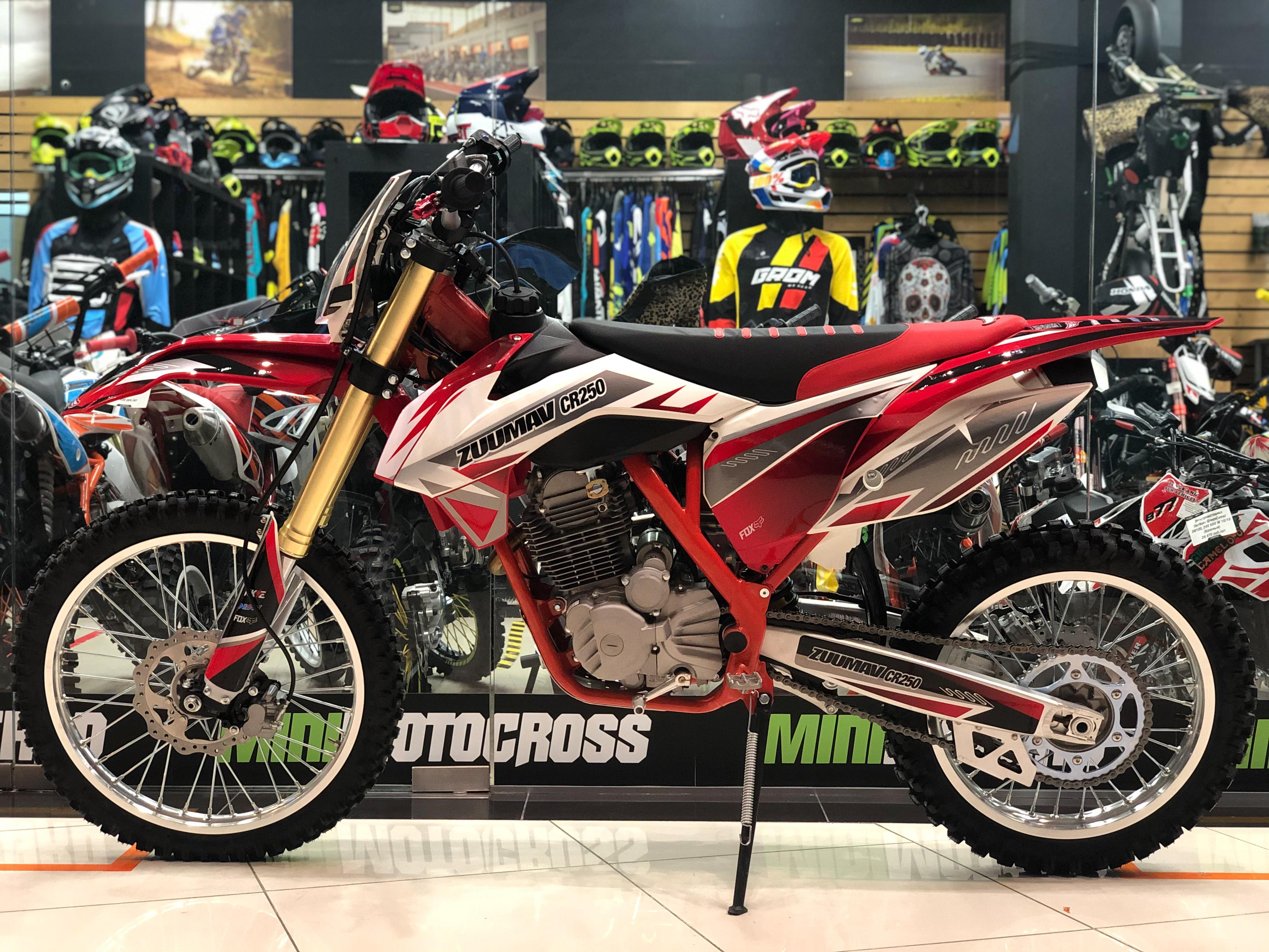 Одна из самых популярных моделей компании Zuumav. В ней сосредоточены все передовые наработки и технологии. Стоит так же обратить внимание и на яркий дизайн, стальная рама хром-молибденовая повышенной прочности, красного цвета. На ней бело красная графика. Двигатель четырехтактный 172FMM 250 куб. мощностью в 21 л.с. с воздушным охлаждением и пяти ступенчатой механической коробкой. Карбюратор установлен NIBBI RACING 30, отличное решение, компания хорошо себя зарекомендовала. В Zuumav CR250 CB чувствуется внимание к деталям: выхлопная система из нержавеющей стали с резонатором, алюминиевый глушитель FMF. Полностью регулируемая подвеска ККЕ. Усиленные диски и ступицы из алюминия с установленными буксаторами AJ1. Большой бак черного цвета 6.7 литров. Удобное противоскользящее и износостойкое сиденье. Стоит диодная фара с хорошим освещением, при использовании в темное время суток у вас не возникнет проблем и ваш маршрут будет хорошо освещен.